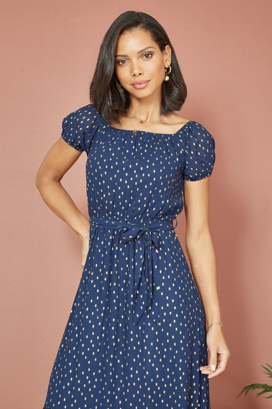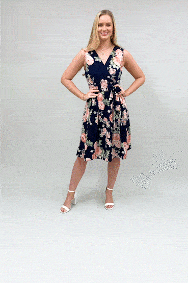 Holiday OfferMela Navy Rose Printed Wrap Over Sleeveless Skater Dress