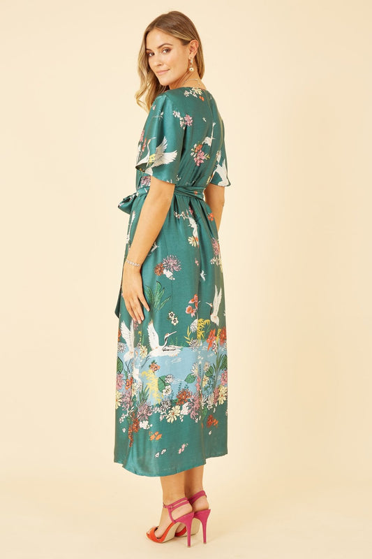 Holiday OfferGreen Floral Kimono Sleeves Dip Hem Wrap Midi Dress