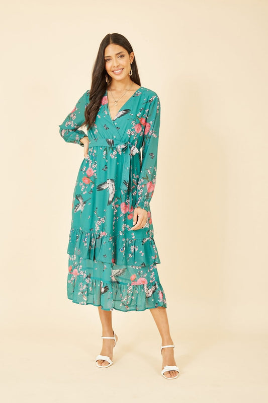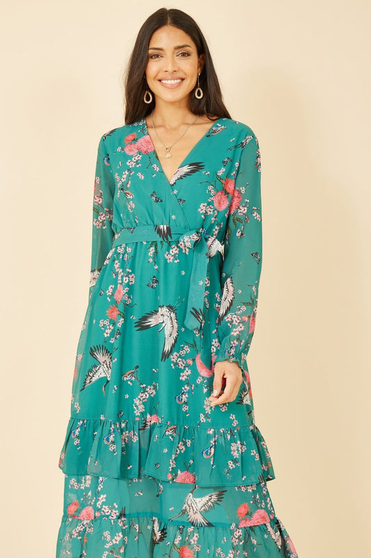 Yumi – Grünes Wickelkleid mit Blumenmuster und Plissee