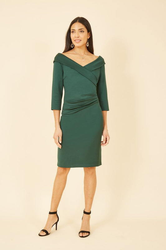 Yumi Green – Bardot-Midikleid mit kleinem Blumenmuster und nach unten abfallendem Saum