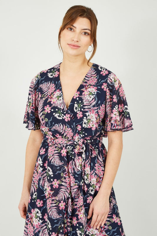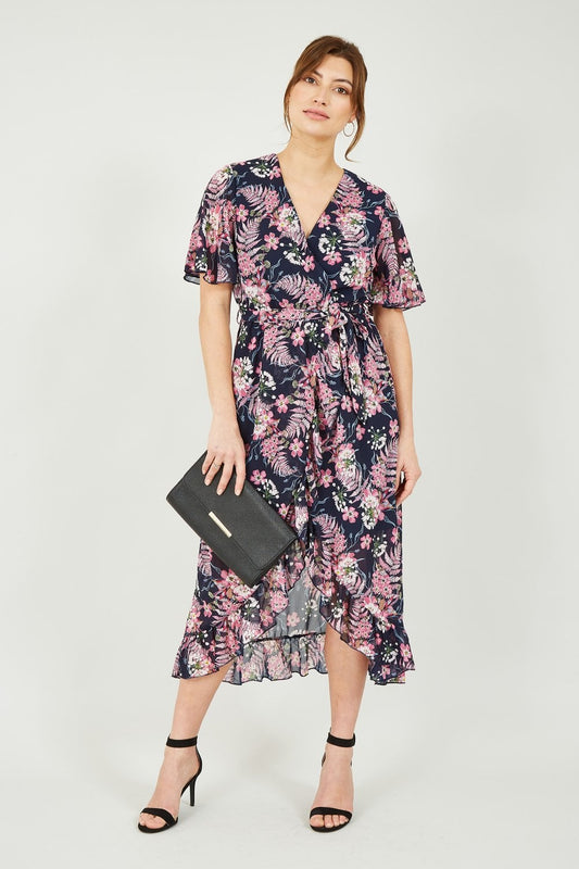 Yumi – Marineblaues Midi-Wickelkleid mit Blumenmuster