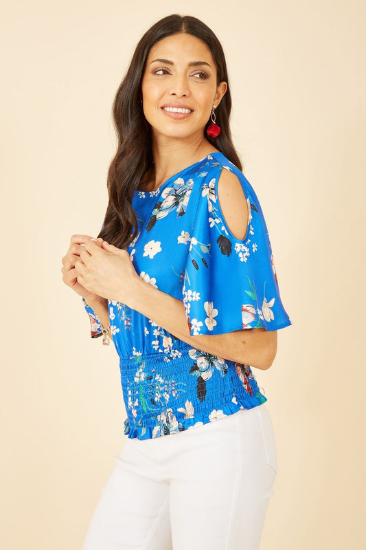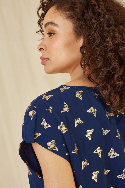 Yumi – Locker geschnittenes Oberteil aus glitzerndem Samt in Marineblau mit geriffelten Ärmeln