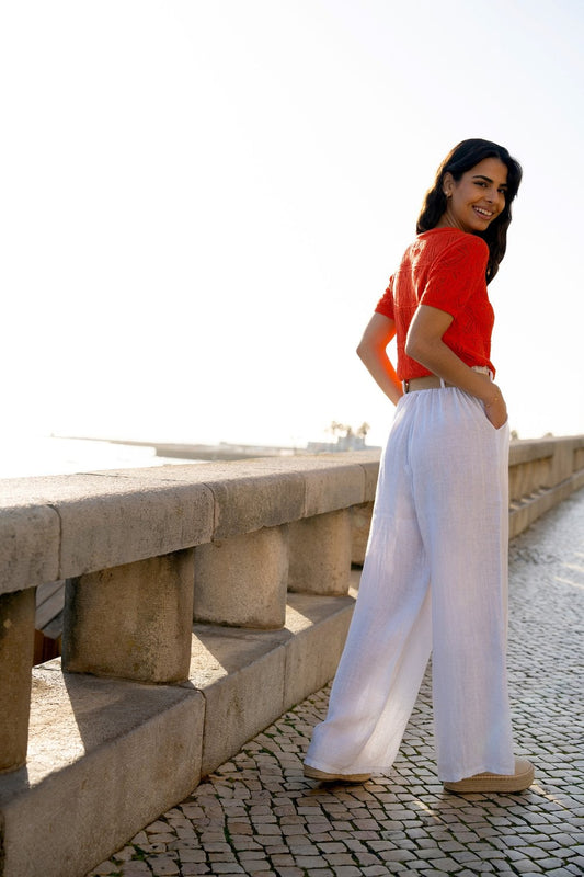 Yumi – Weißes, geripptes Strickoberteil mit Spitzenärmeln
