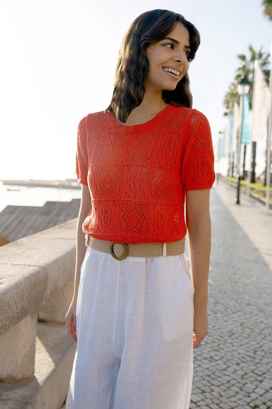 Yumi – Rotes Bardot-Oberteil aus Jersey-Baumwolle mit Knotendetail