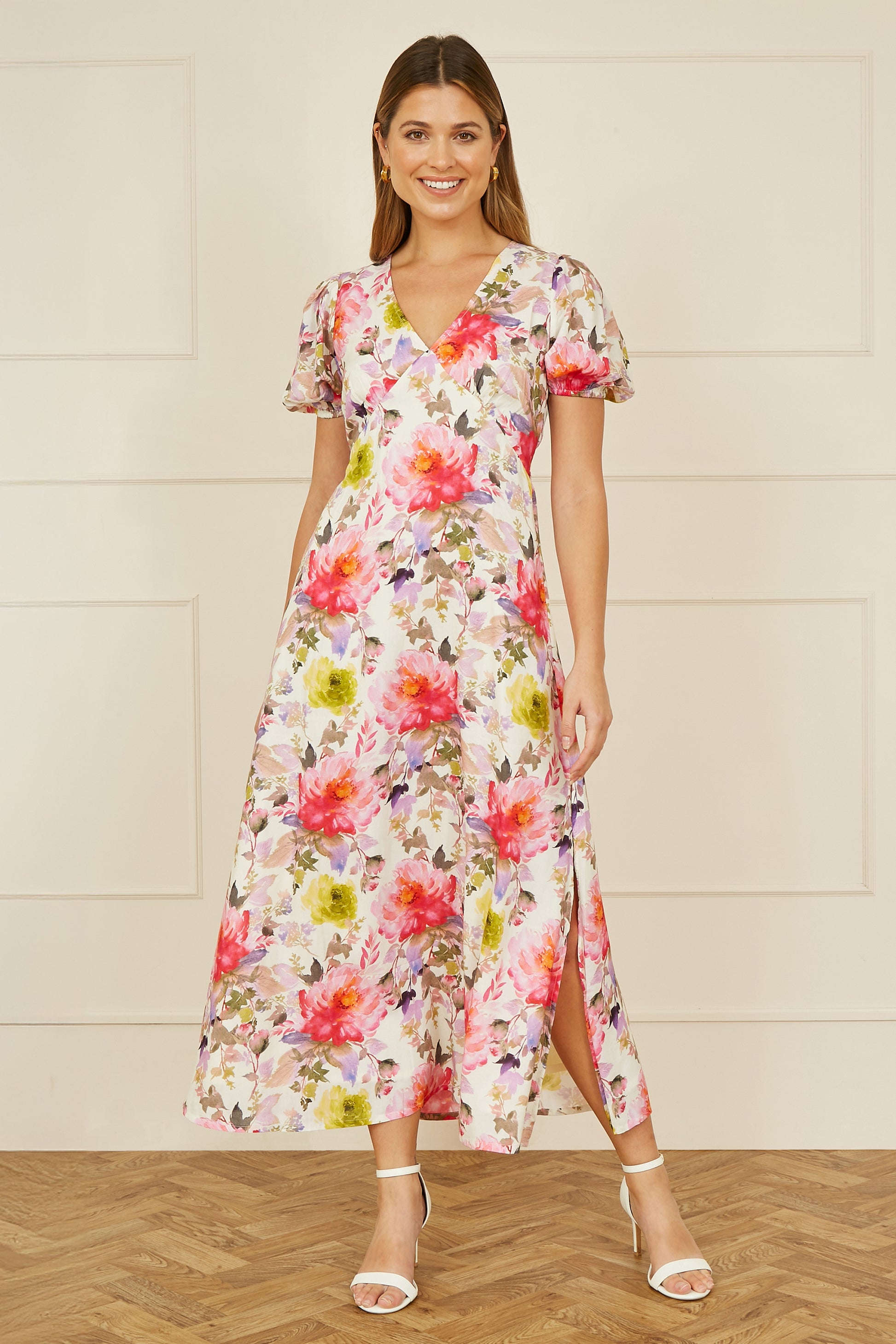 Da die Hochzeitssaison vor der Tür steht, haben wir das passende Kleid für Ihre Gäste. Der Allover-Blumendruck im Aquarell-Stil ist ein echter Hingucker für die neue Saison. Midilänge, süße Puffärmel und V-Ausschnitt – Eleganz pur.