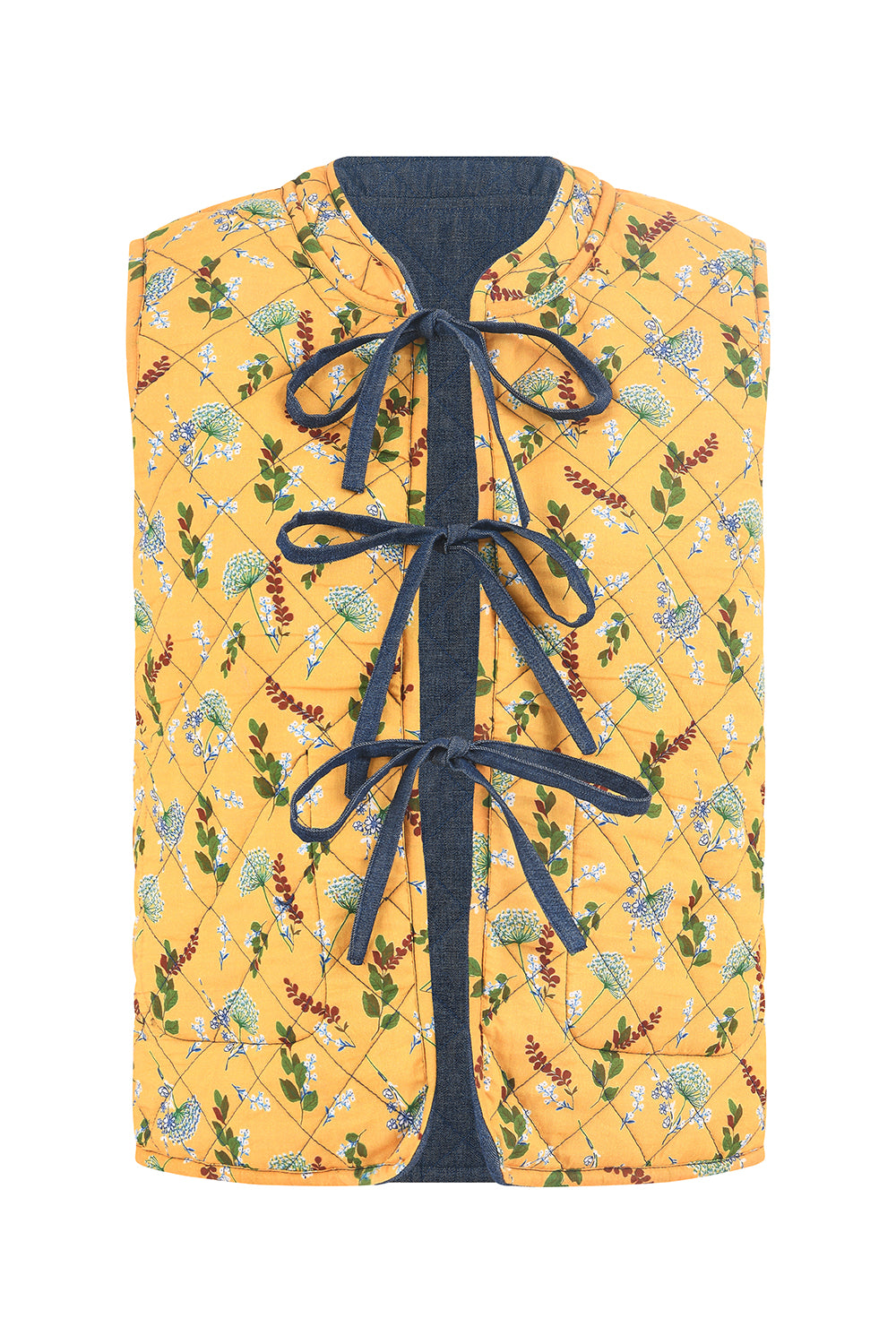 Ce gilet polyvalent, fabriqué à l'aide de techniques de matelassage traditionnelles, apportera un peu de soleil dans votre garde-robe - Avec un style denim chambray qui peut être inversé pour mettre en valeur la doublure florale lumineuse et colorée. Avec un devant noué et des poches - Nous adorons cela pour les changements de saison.