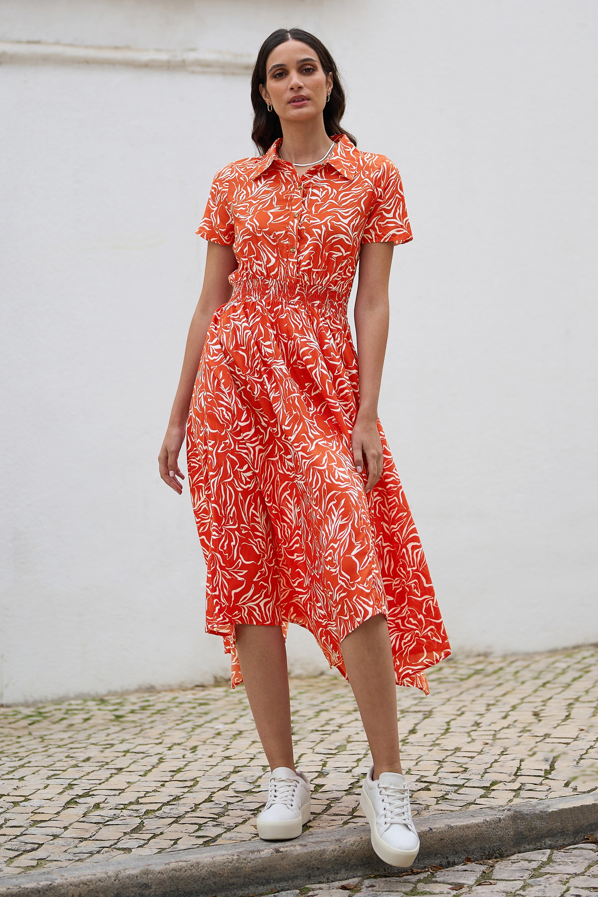 Si vous avez envie d'escapades cet été, cette robe midi est idéale à emporter avec vous. Avec sa coupe chemise boutonnée et son magnifique imprimé tropical, le tissu modal est doux et léger. Son ourlet plongeant midi est fluide et féminin. Portez-la avec des sandales et un sac en osier pour une tenue parfaite au soleil.