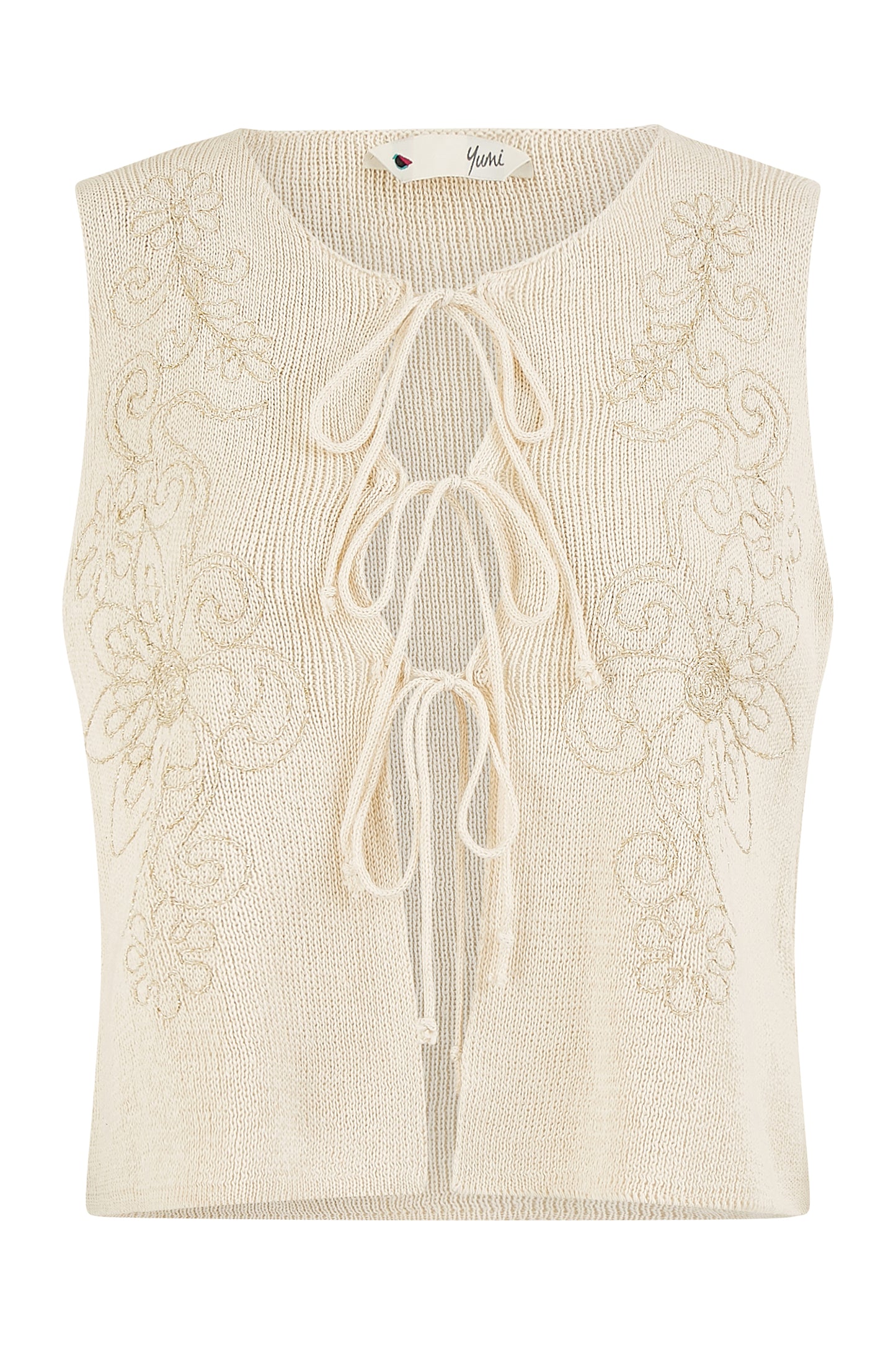 Yumi Beige Knitted Tie Front Waistcoat With Floral Details