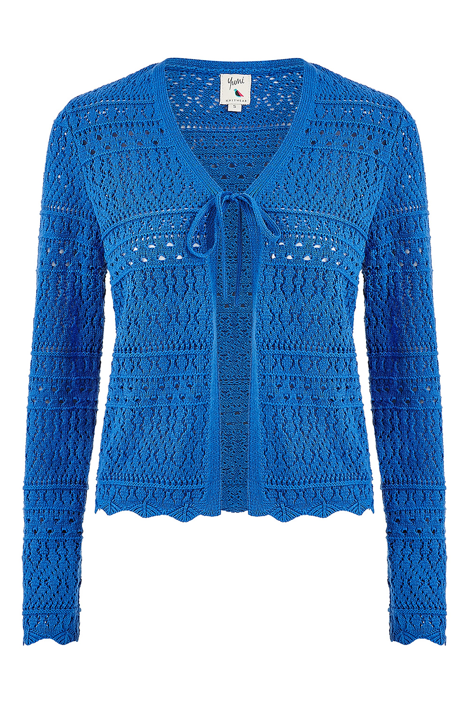 In a super cute and bang on trend crochet knit, this little cardigan will see you through the spring. With a tie front fastening, long sleeves and a hip length fit - It's a super versatile little number that can be worn with anything to keep the chill off.