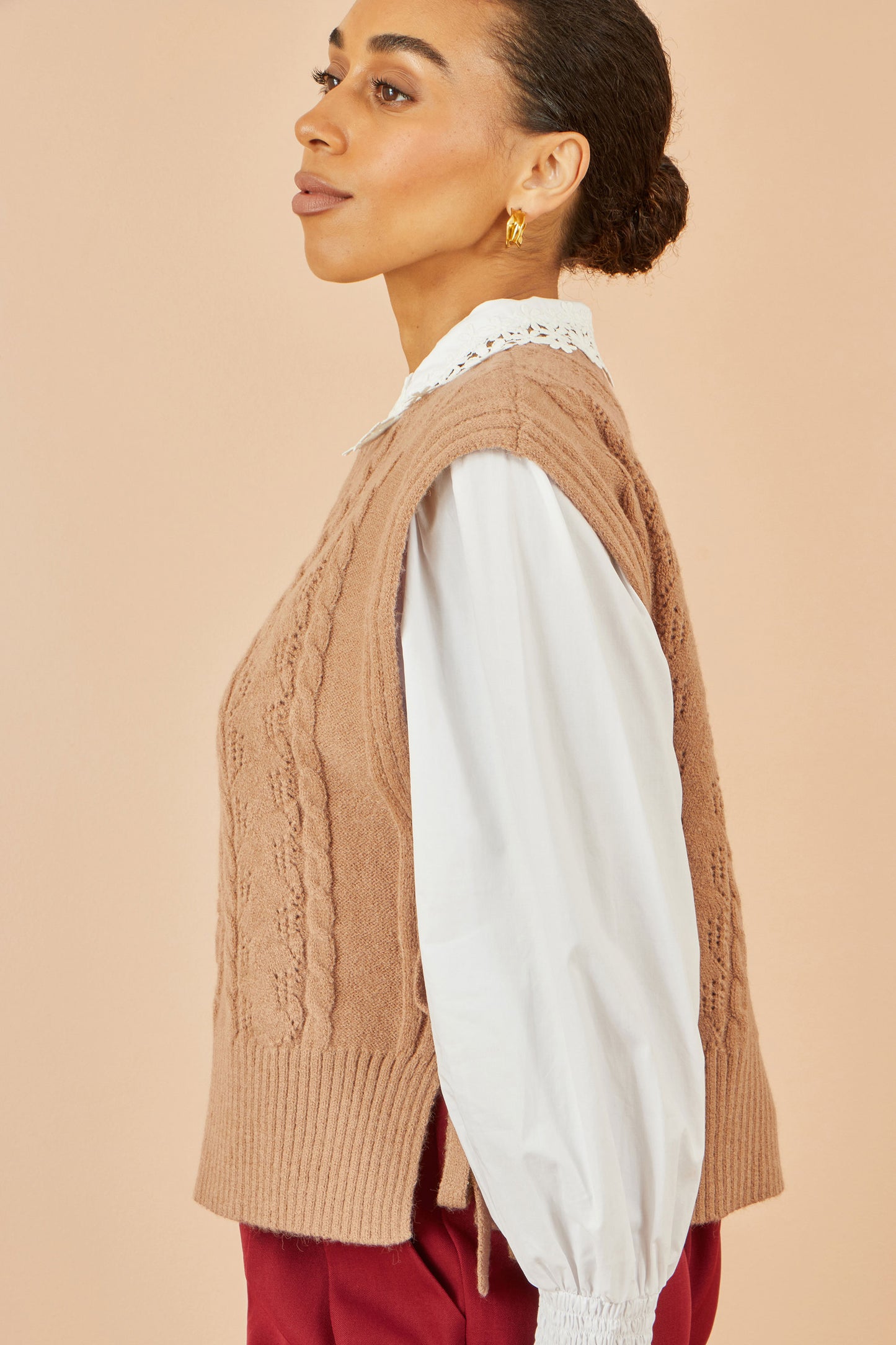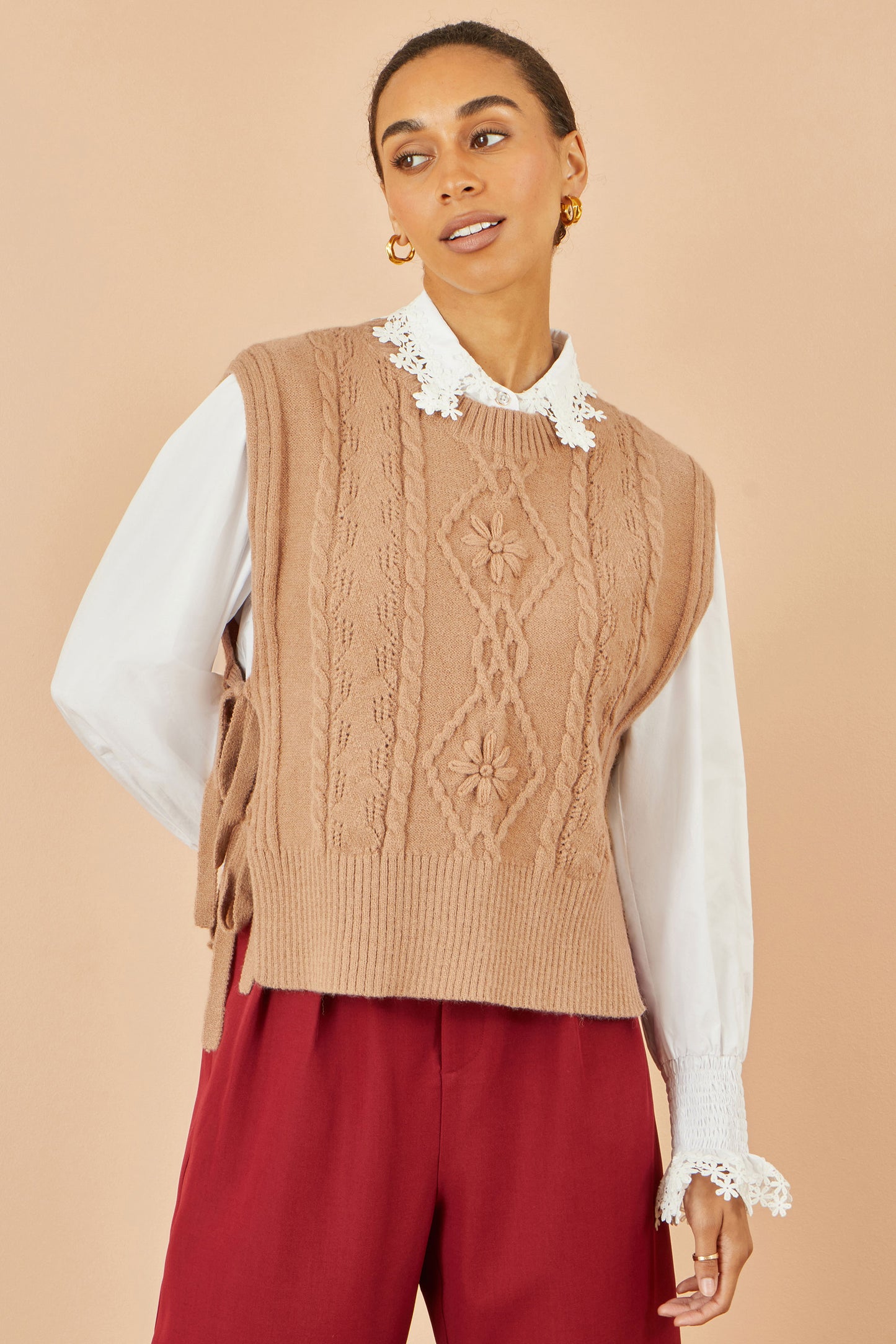 A unique piece of knitwear that is versatile and bang on trend. The flower cable knit is whimsical, with the tie sides of the pullover adding a twist on traditional design. Layer this over long sleeves to add a cosy flair to your everyday wear.
